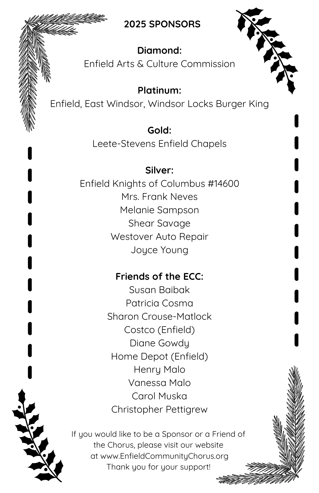 If you would like to become a sponsor of the Enfield Community Chorus, please email us at EnfieldCommunityChorus@gmail.com. You can also scroll down to see the different tiers of support that are available. Thank you so much!
